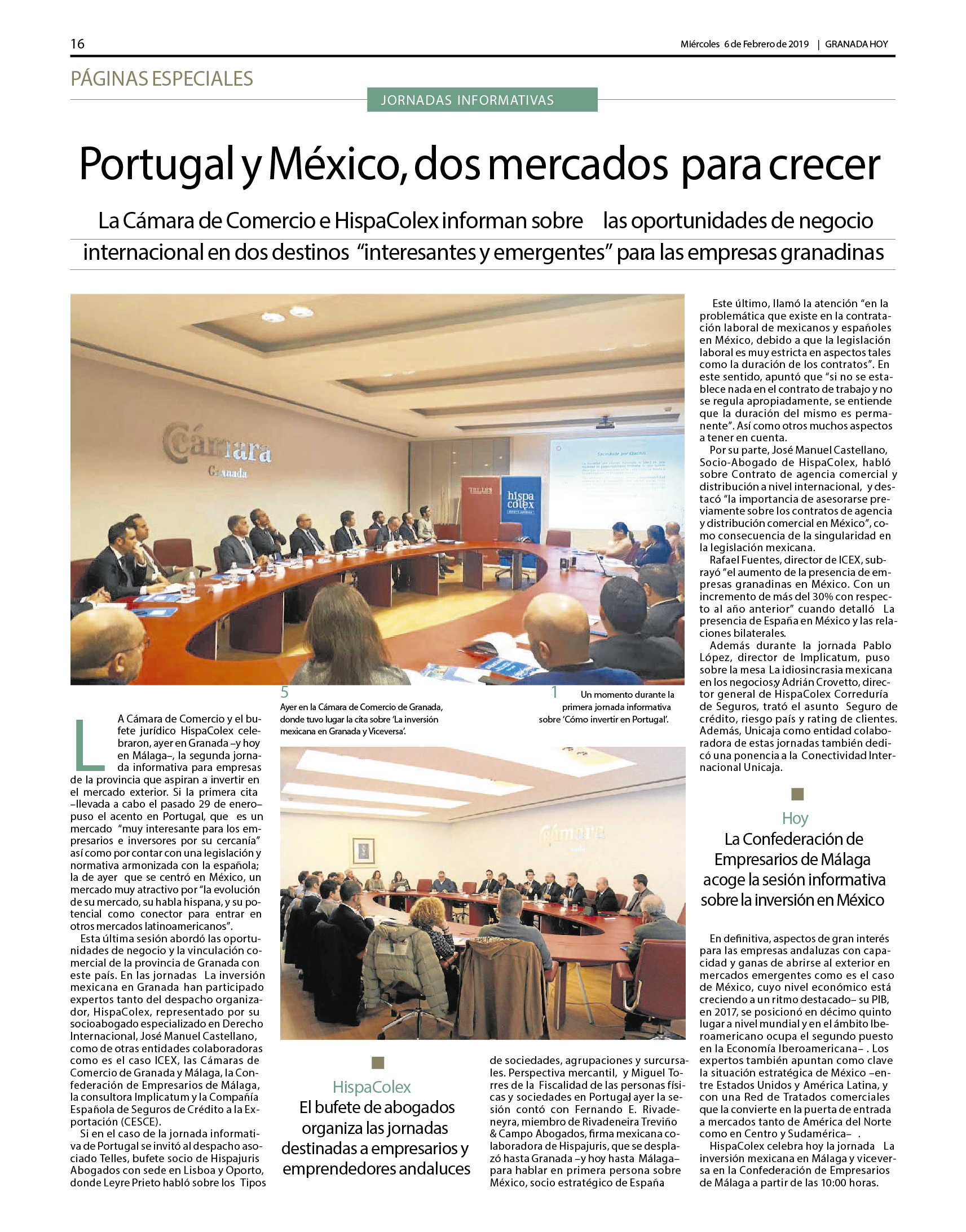 El periódico Granada Hoy se hace eco de las jornadas informativas realizadas en las provincias de Granada y Málaga, organizadas por HispaColex Bufete Jurídico. Estas jornadas estaban destinadas a informar a los empresarios andaluces sobre las oportunidades de negocio de dos destinos interesantes y emergentes como es el caso de Portugal y México.