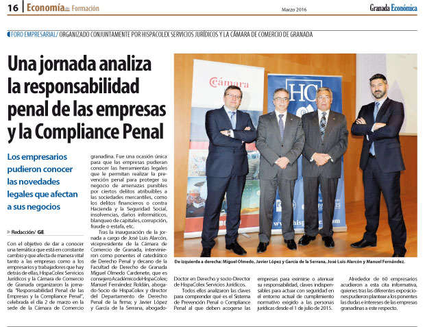 HispaColex organiza una jornada para analizar la responsabilidad penal de las empresas y la Compliance Penal. (Granada Económica)