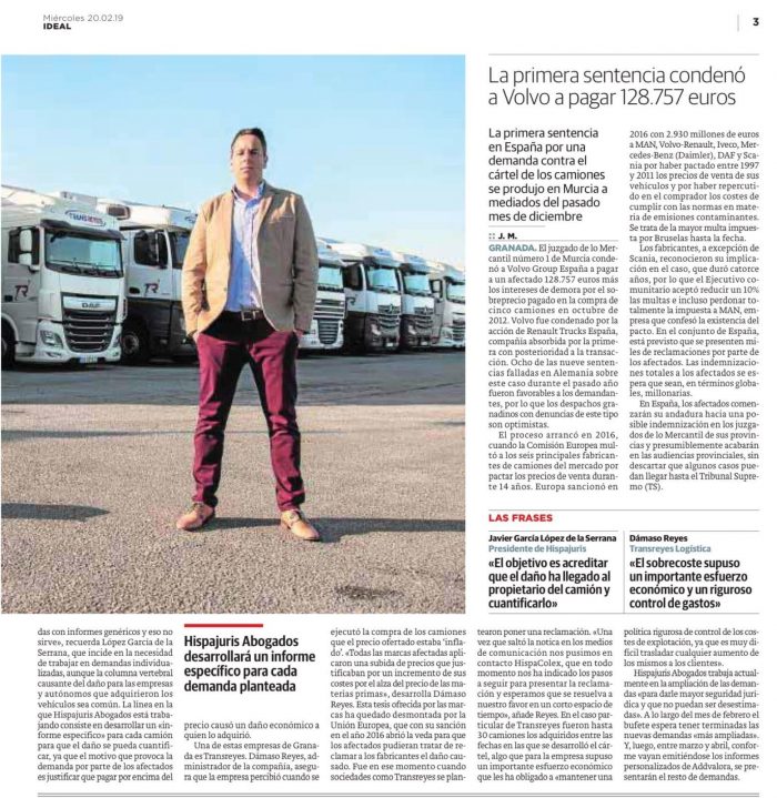 El periódico IDEAL ha publicado un artículo en el que nuestro director, Javier López y García de la Serrana, habla sobre el cártel de los camiones. Este caso se conoció a finales de 2016 y está teniendo ya las primeras sentencias en tribunales españoles. Todo se originó entre los años 1997 y 2011, cuando seis fabricantes de estos vehículos pactaron los precios y ya fueron sancionados por la UE en 2016. El proceso, que se ha dilatado a lo largo de los dos últimos años, integra a más de 19.000 camiones en todo el país.