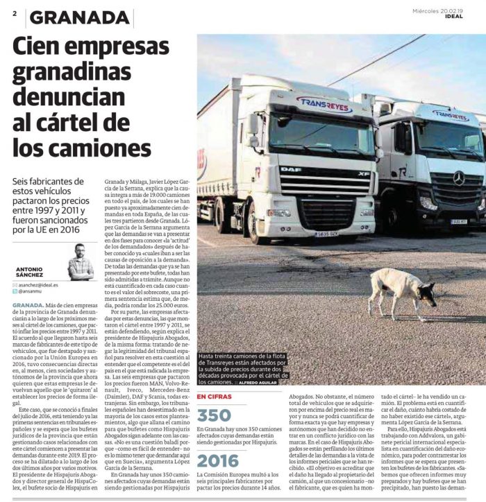 En Granada hay unos 350 camiones afectados cuyas demandas están siendo gestionadas por Hispajuris, red de despachos que también preside García de la Serrana. Además, Hispajuris Abogados desarrollará un informe específico para cada demanda planteada para que el daño provocado en cada afectado se pueda cuantificar, ya que el motivo que provoca la demanda por parte de los afectados es justificar que pagar por encima del precio causó un daño económico a quien lo adquirió.