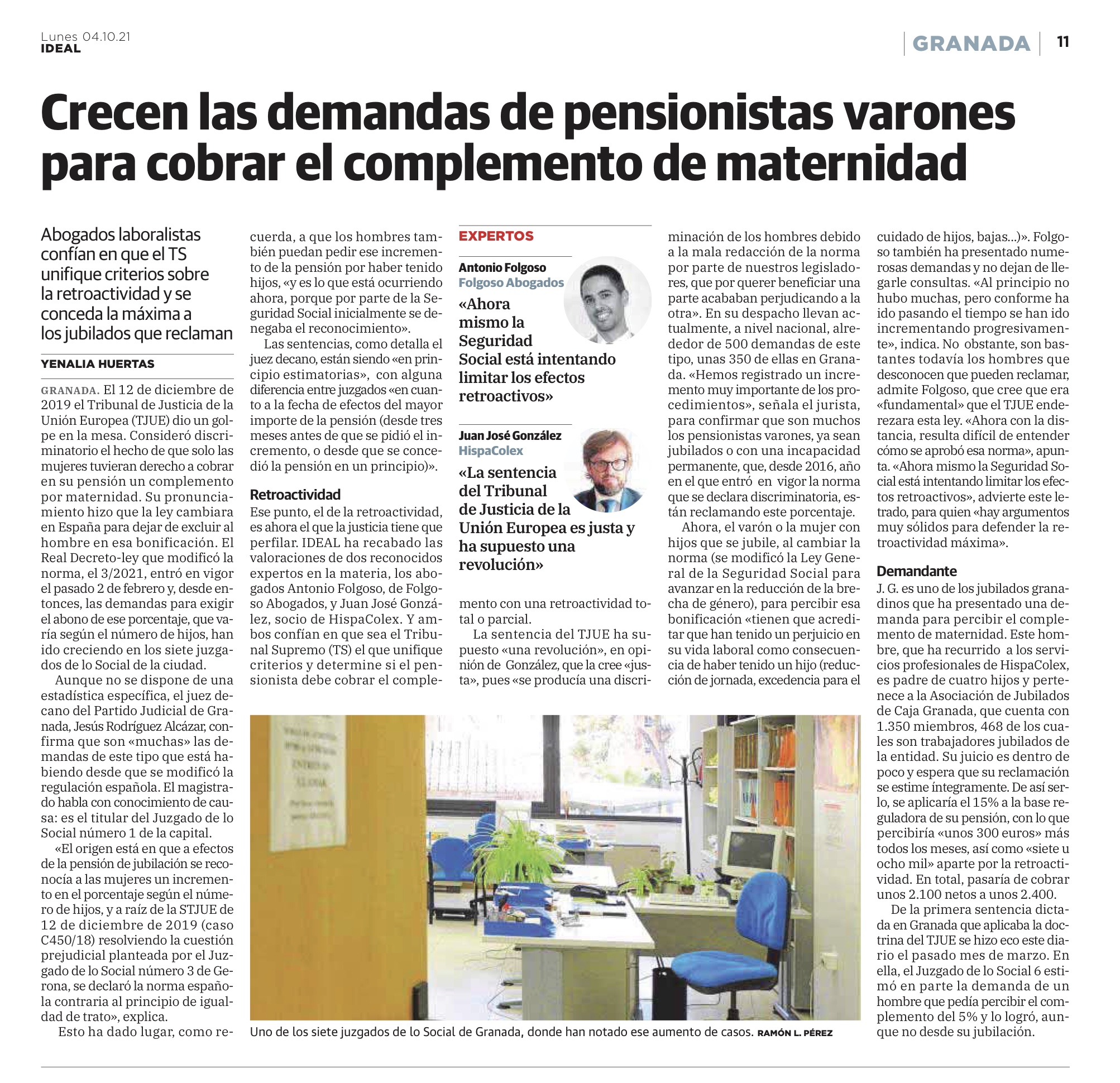 04/10/2021 Ideal: Crecen las demandas de pensionistas varones para cobrar el complemento de maternidad  Abogados en Granada, Málaga y Jaén < AnteriorSiguiente > Los comentarios están cerrados.