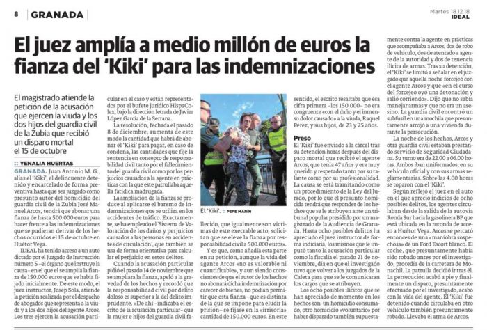 De este modo, el juez instructor, Josep Sola, atiende la petición realizada por el despacho de abogados que representa a la viuda y a los dos hijos del agente Arcos. Los tres ejercen la acusación particular en el caso y están representados por el bufete jurídico HispaColex, bajo la dirección letrada de Javier López García de la Serrana.