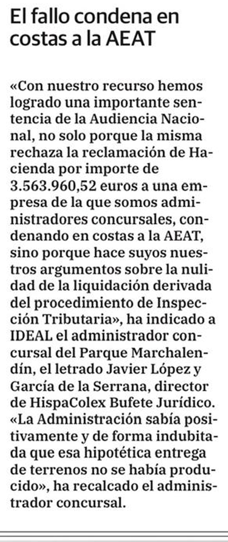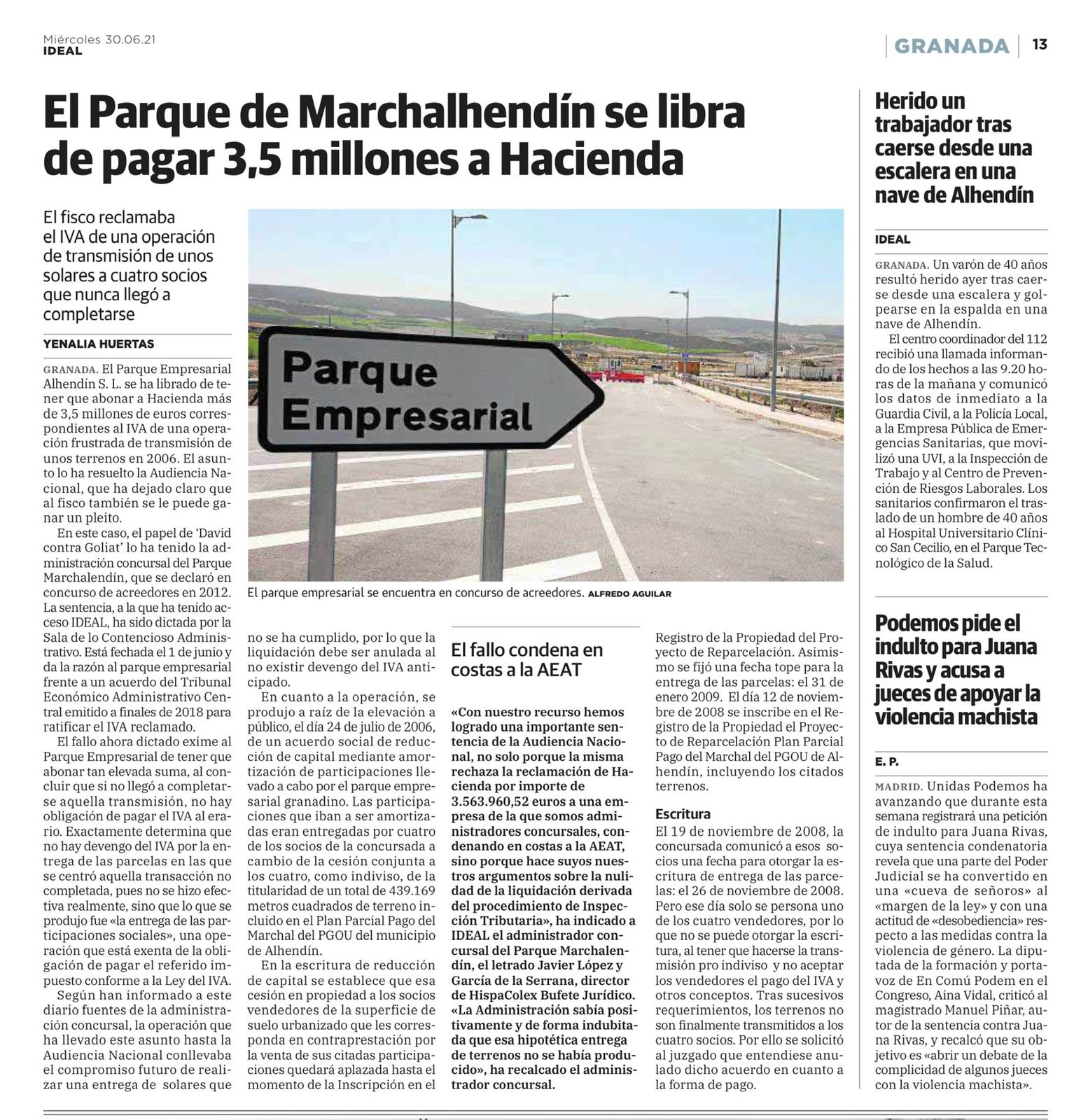 30/06/2021 IDEAL: El Parque de Marchalhendín se libra de pagar 3,5 millones a Hacienda Extracto de la noticia del diario IDEAL  Abogados en Granada, Málaga y Jaén < AnteriorSiguiente > Los comentarios están cerrados.