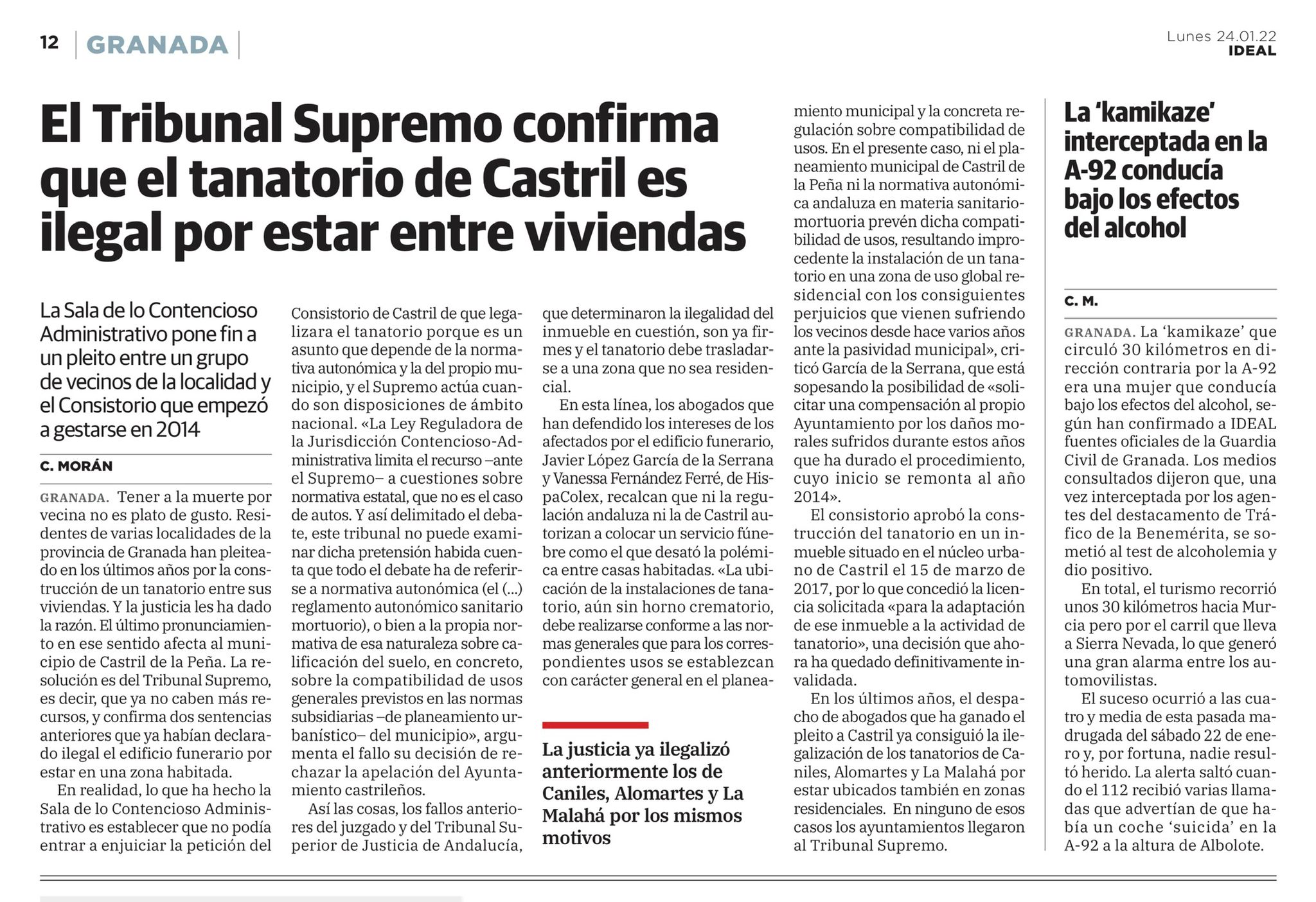 En los últimos años, el despacho de abogados (HispaColex Bufete Jurídico) que ha ganado el pleito a Castril ya consiguió la ilegalización de los tanatorios de Caniles, Alomartes y La Malahá por estar ubicados también en zonas residenciales.