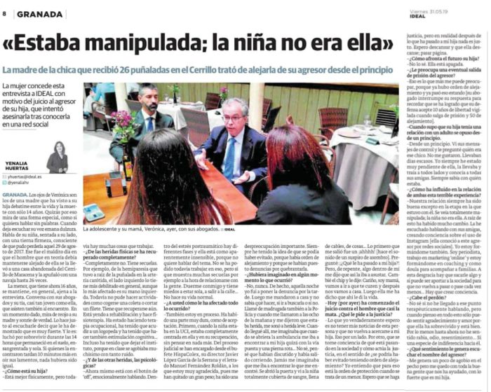 El periódico IDEAL publica en su edición impresa una entrevista a Verónica, la madre de la niña que con solo 14 años tuvo que debatirse entre la vida y la muerte. Su agresor, mayor de edad, le llegó a asestar hasta 26 puñaladas.