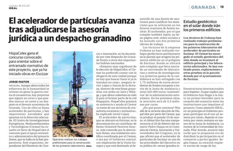 El periódico Ideal se hace eco de la elección del bufete granadino HispaColex para orientar sobre el entramado normativo del acelerador de partículas que ya ha iniciado obras en la localidad de Escúzar.