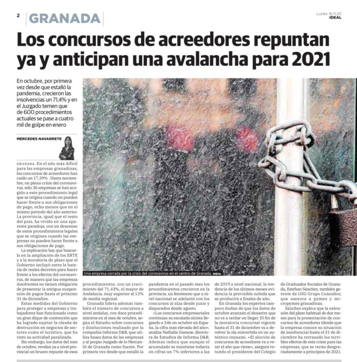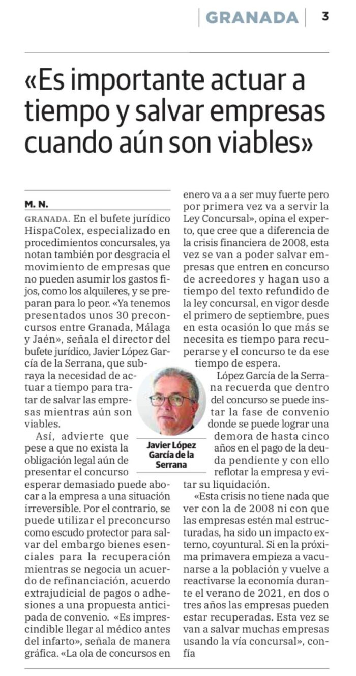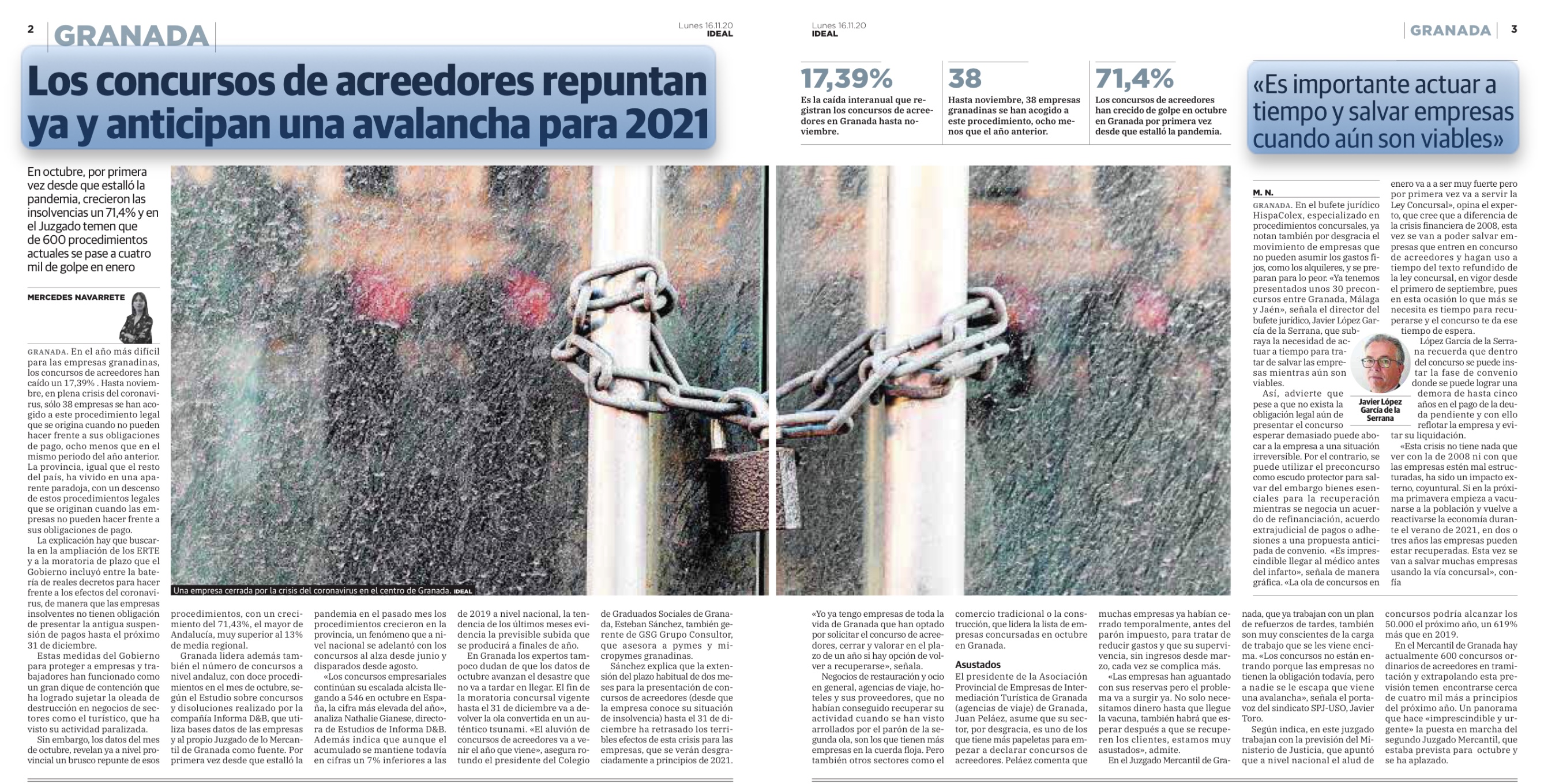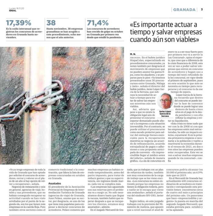 El diario IDEAL dedica un reportaje a doble página al incremento esperado de concursos de acreedores motivado por la crisis económica y realiza una entrevista a Javier López y García de la Serrana, director de HispaColex, Bufete que cuenta con un Departamento de Derecho Concursal integrado por abogados y economistas expertos en la materia.