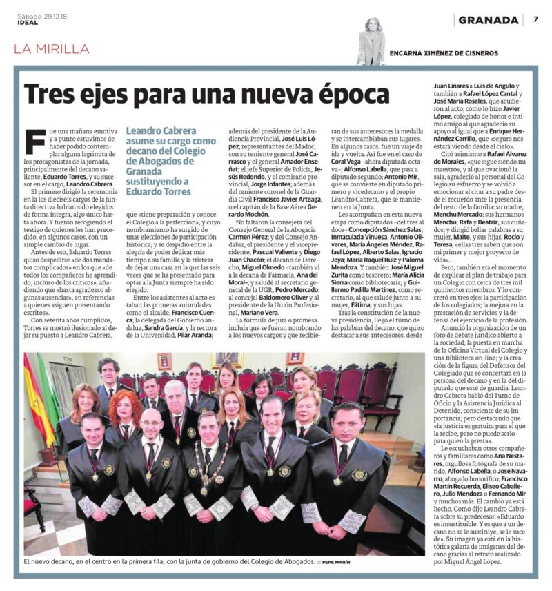Leandro Cabrera Mercado asume su cargo como Decano del Colegio de Abogados de Granada rodeado de un gran equipo de compañeros entre los que se encuentra Mª Raquel Ruíz García, Socio-Abogada de HispaColex Bufete Jurídico.