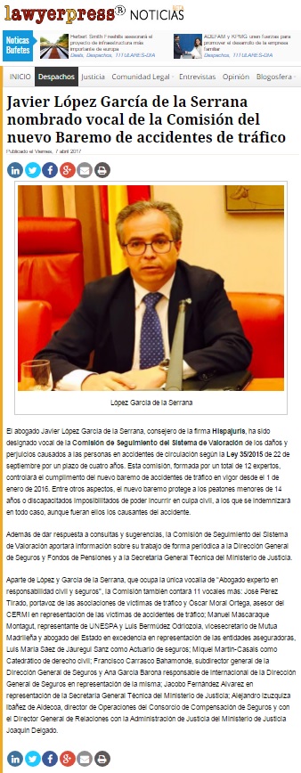 10/04/2017 Lawyerpress: Javier López García de la Serrana nombrado vocal de la Comisión del nuevo Baremo de accidentes de tráfico Acceso al contenido completo del artículo  HispaColex < AnteriorSiguiente > Deja una respuesta Cancelar la respuestaTu dirección de correo electrónico no será publicada. Los campos obligatorios están marcados con *Comentario * Nombre * Correo electrónico * Web Guarda mi nombre, correo electrónico y web en este navegador para la próxima vez que comente. Δ