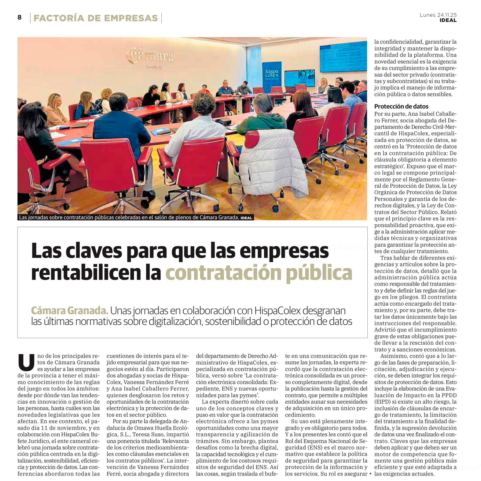Uno de los principales retos de Cámara Granada es ayudar a las empresas de la provincia a tener el máximo conocimiento de las reglas del juego en todos los ámbitos: desde por dónde van las tendencias en innovación o gestión de las personas, hasta cuáles son las novedades legislativas que les afectan. En este contexto, el pasado día 11 de noviembre, y en colaboración con HispaColex Bufete Jurídico, el área de Empresa celebró una jornada sobre contratación pública centrada en la digitalización, sostenibilidad o protección de datos. Las soluciones tecnológicas son uno de los principales cuestiones de interés para el tejido empresarial para que sus negocios estén al día. Participaron dos abogadas y socias de HispaColex, Vanesa Fernández Ferrer y Ana Isabel Caballero Ferrer, quienes desgranaron los retos y novedades de la contratación pública y la protección de datos.