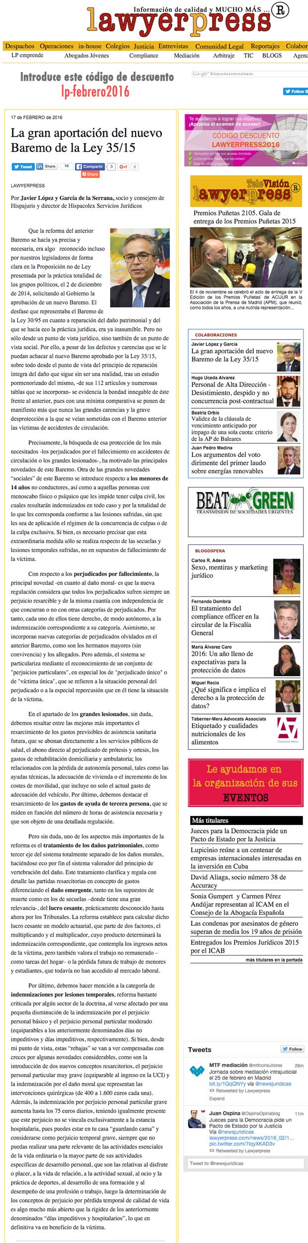 Artículo en Lawyerpress de nuestro director, Javier López y García de la Serrana, sobre la aportación que ha supuesto el nuevo Baremo