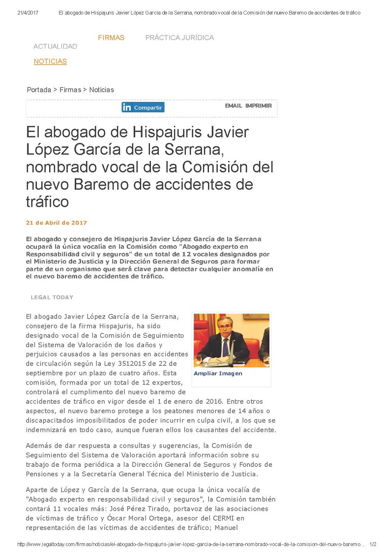 Legal Today: El abogado de Hispajuris Javier López García de la Serrana, nombrado vocal de la Comisión del nuevo Baremo de accidentes de tráfico