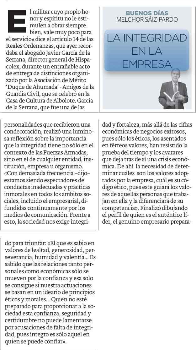 «La integridad en la Guardia Civil Vs la integridad en la empresa», fue el título de la intervención del director de HispaColex, Javier López y García de la Serrana, al imponerle la Gran Cruz Distinguida al Mérito por la Asociación Nacional de Mérito Duque de Ahumada