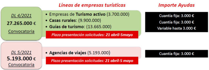 En el BOJA extraordinario número 35 publicado en la tarde del día 20 de abril, se publica el Extracto de la convocatoria de subvenciones para el sector turístico reguladas en el Capítulo I del Decreto-ley 4/2021, de 23 de marzo (empresas de turismo activo, casas rurales y guías de turismo), por el que se adoptan medidas, con carácter urgente y extraordinario, como consecuencia de la situación ocasionada por el coronavirus (COVID-19). Así mismo, se convocan las subvenciones para las agencias de viajes reguladas en el Decreto-ley 5/2021.