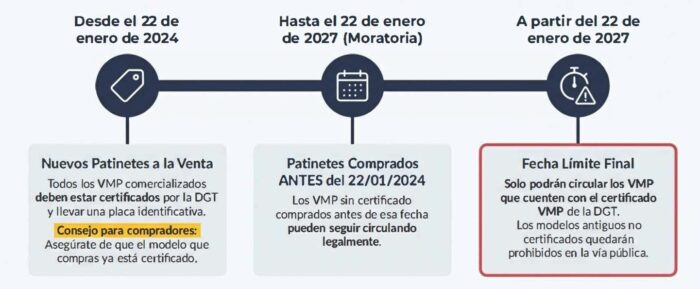 Los usuarios que compararon su patinete antes del 22 de enero de 2024 y no dispone del certificado de circulación, cuentan con un periodo de transición que permite seguir utilizándolo hasta el 22 de enero de 2027. A partir de esa fecha, únicamente podrán circular los VMP que cumplan con la homologación y cuenten con el certificado correspondiente.