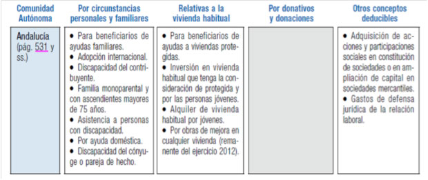 - Se deben comprobar, en cada Comunidad Autónoma, las deducciones que se establecen de manera adicional y que complementan a las estatales. El cuadro siguiente resume las reconocidas en Andalucía: